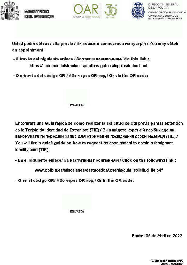 Así pues, con la PRIMERA CITA en la Comisaría de la Policía Nacional en la Brigada de Extranjeros, se formalizará la solicitud de protección temporal, facilitando un RESGUARDO DE LA PRESENTACIÓN DE SOLICITUD DE PROTECCIÓN TEMPORAL (TARJETA BLANCA), en el que constará el NIE asignado y que habilita a permanecer provisionalmente en el territorio, acceder a las prestaciones del sistema de acogida y a trabajar provisionalmente a partir de 24h desde la fecha de la solicitud.