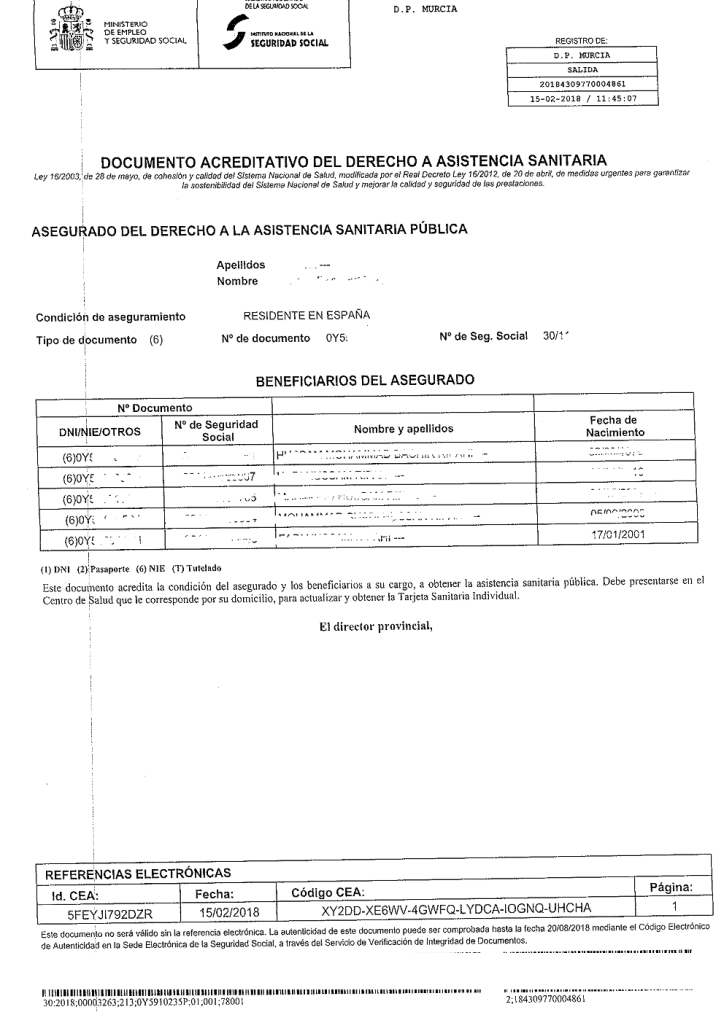 Deben acudir al INSS para iniciar la solicitud de reconocimiento de asistencia sanitaria. Y según la normativa tiene derecho a la asistencia sanitaria toda persona residente legal.